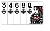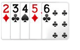 STRAIGHT : kombinasi kartu ini sama dengan STRAIGHT FLUSH, bedanya kalau STRAIGHT tidak memandang bunga, bunganya boleh bebas , misal : 4 ♠ - 5♥ - 6♦ - 7 ♣ - 8♦ atau 10♥ - J ♣ - Q ♠ - K♦ – As ♣